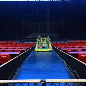 軌道根據演出創(chuàng)意和使用需求不同,可以為直線,也可以是不規(guī)則曲面弧線導軌(需考慮平移裝置最小轉彎半徑);平移一般采用自適應摩擦輪傳動方式,在高定位精度使用場合,可采用齒輪齒條傳動;根據軌道形制不同,可采用拖令供電或滑觸線供電方式;在軌道為不規(guī)則且較長時,一般采用滑觸線方式;平移一般采用光柵定位,定位準確,且可適應不規(guī)則軌道。