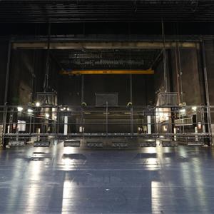 設(shè)置于主舞臺(tái)上空,用于吊掛舞臺(tái)燈具?,F(xiàn)在一般較少設(shè)燈光渡橋,如設(shè),較常設(shè)在主舞臺(tái)后區(qū)(即天幕景區(qū))上空。燈光渡橋與一層天橋通過(guò)“碼頭”相連,許可2名工作人員進(jìn)入燈光渡橋工作。碼頭形式一般為翻轉(zhuǎn)式,翻轉(zhuǎn)到位后固定于天橋上。燈光渡橋的兩側(cè)設(shè)計(jì)便于安裝燈具,設(shè)電纜收納裝置。一層天橋兩側(cè)與“碼頭”對(duì)應(yīng)位置各設(shè)一道安全防護(hù)門(mén)。天幕燈光渡橋上一般鋪設(shè)5mm厚的鋼板網(wǎng)(QB/T3896-1999)TL=22mm,TB=26mm,鋼板網(wǎng)上鋪設(shè)橡膠地板,型號(hào)為天然耐磨膠板,厚度為4mm。