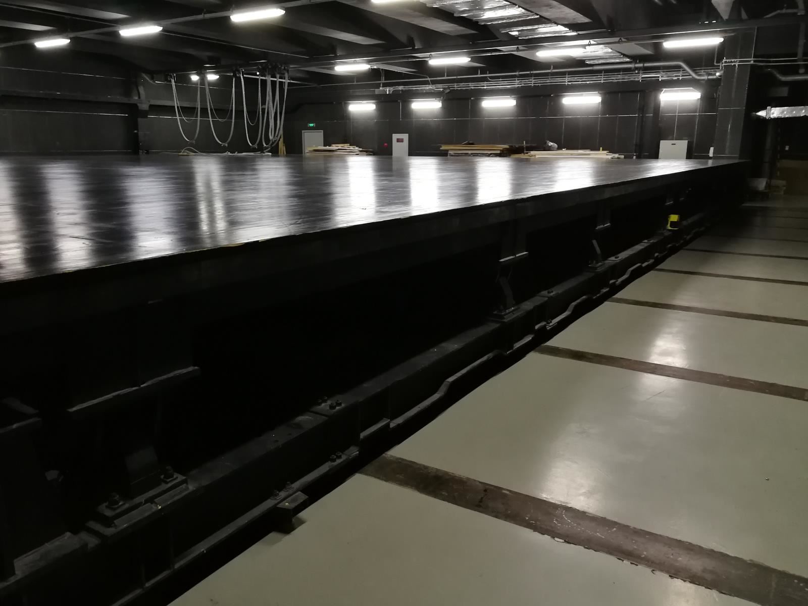 芭蕾舞車臺由安裝在鋼架的支撐輪和2個齒輪架上(齒條驅(qū)動時)的鋼結(jié)構(gòu)桁架組成。外部驅(qū)動裝置隱藏在芭蕾舞車臺臺體和主升降臺臺面之下。與臺車下部的齒條嚙合,向臺車傳送動力。由設(shè)置在第三、四塊主升降臺上的驅(qū)動裝置通過接力技術(shù)完成整個行程驅(qū)動。或可由電動摩擦輪提供行走動力。